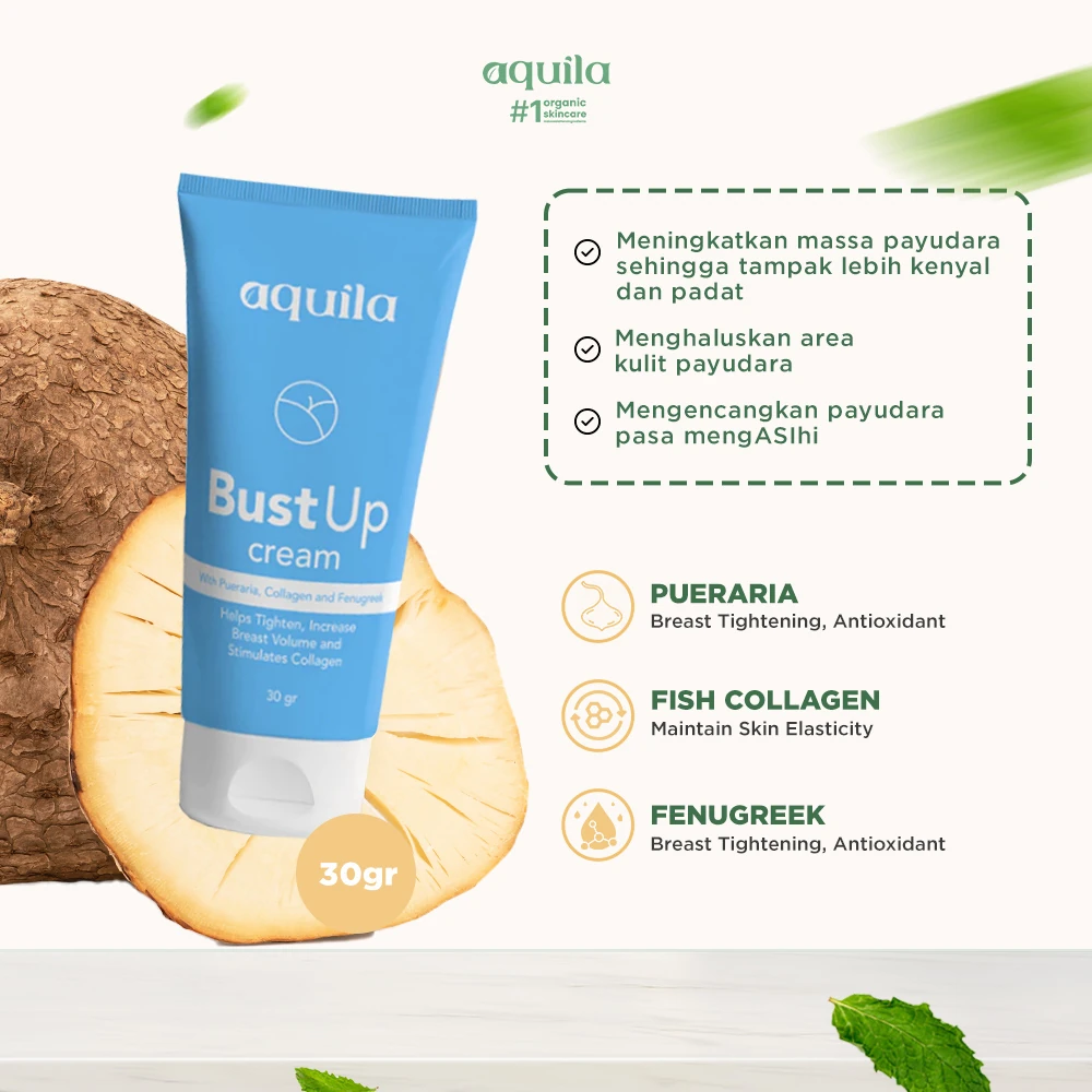 Bust Up Cream mengandung bahan natural dan organik seperti Puerira, Fish Collagen, dan Fenugreek yang efektif menstimulus produksi kolagen secara alami sehingga dapat membantu meningkatkan volume dan mengencangkan payudara.