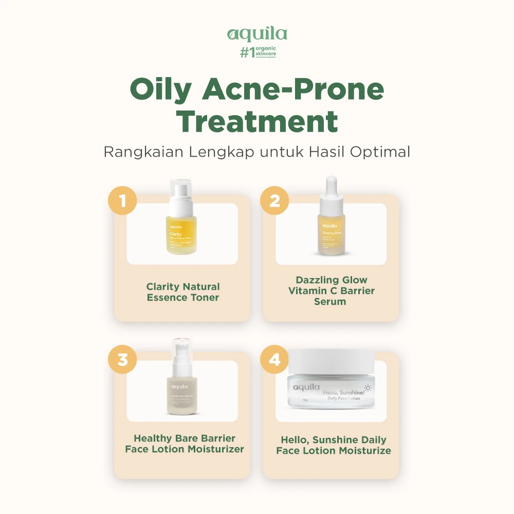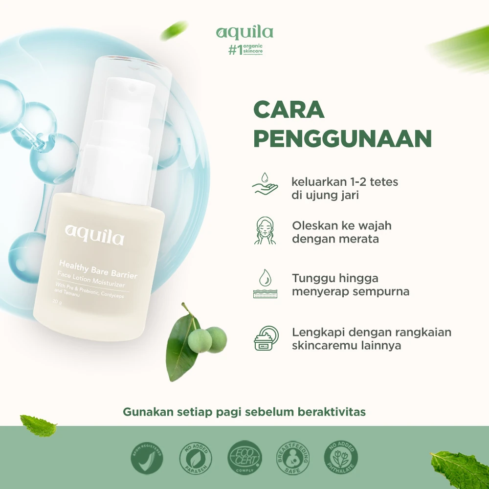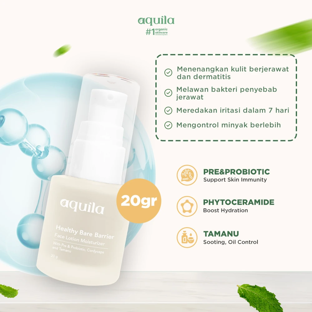 Aquila Healthy Bare Barrier Face Lotion, pelembap ringan berbahan natural & organik yang cocok digunakan untuk semua jenis kulit. Dengan kandungan Phyto Ceramide, Pre & Probiotic, serta Java Tamanu Oil yang efektif memperkuat skin barrier, menjaga kesehatan kulit, dan mengontrol minyak sepanjang hari.