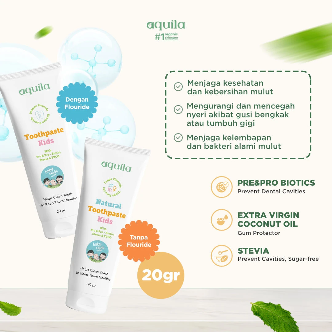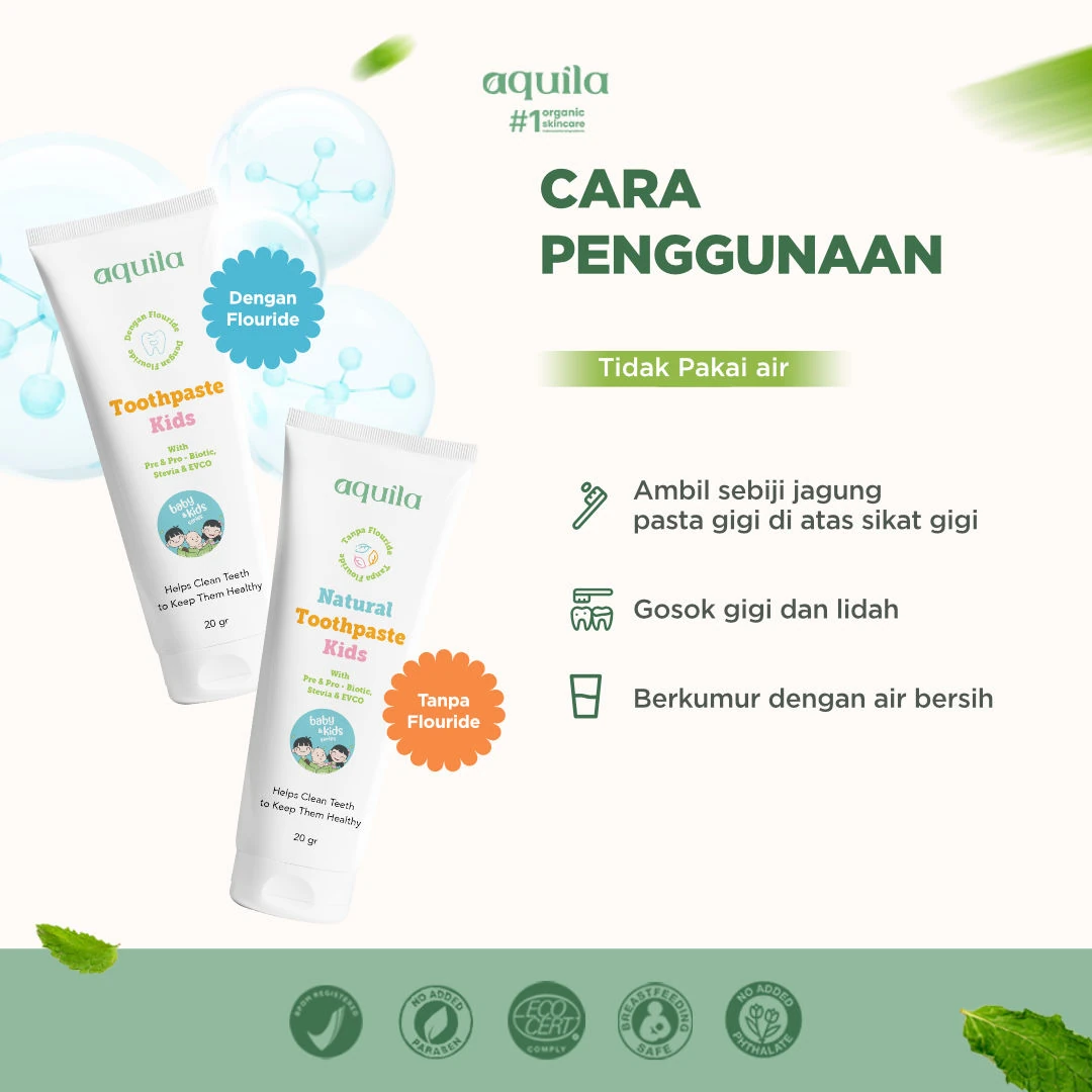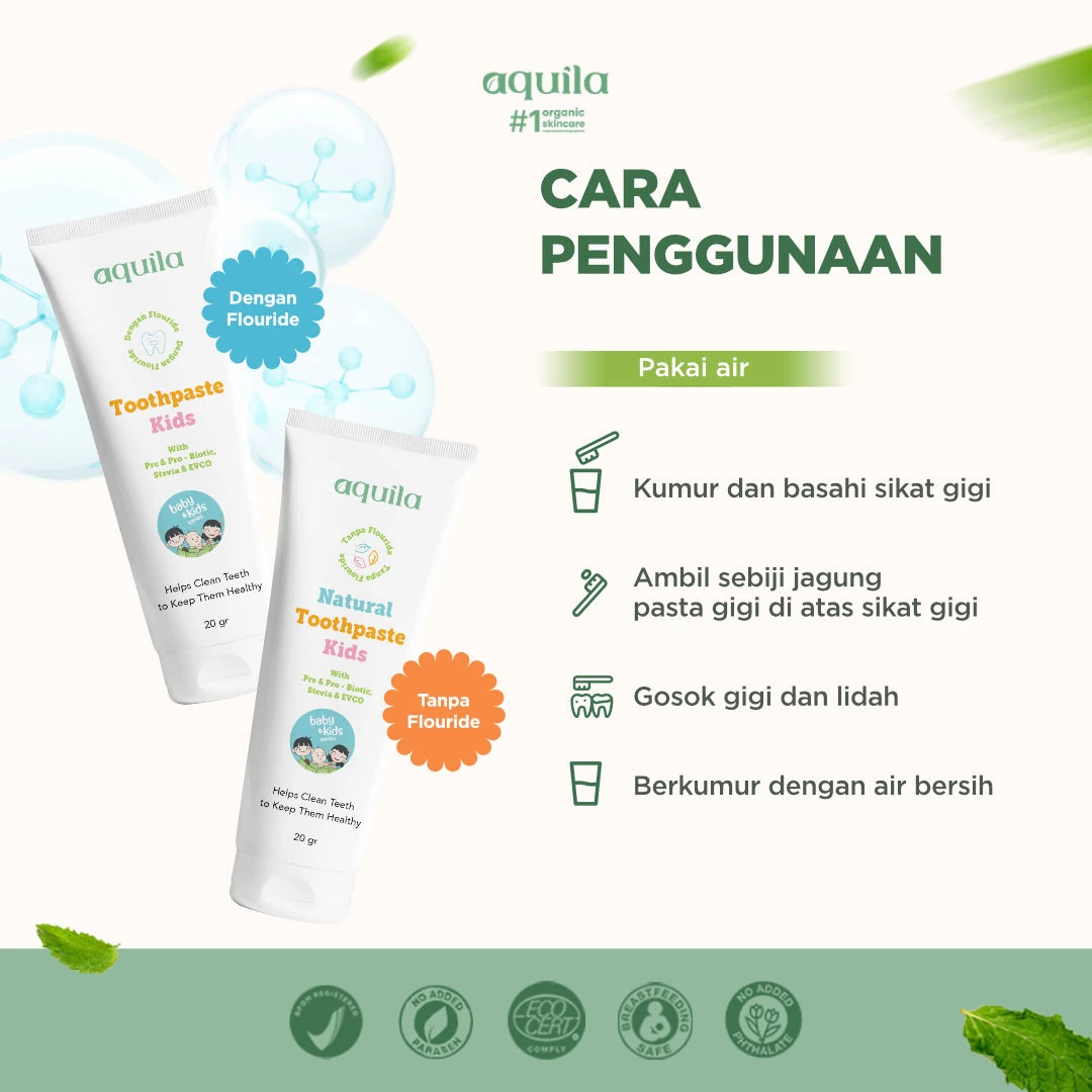 Aquila Kids Toothpaste hadir dengan 2 pilihan yaitu mengandung fluoride dan non fluoride. Diformulasikan dengan menggunakan bahan natural & organik, produk ini aman apabila tidak sengaja tertelan oleh anak-anak. Bagi anak yang baru MPASI cocok menggunakan varian non Fluoride (6-12 bulan)