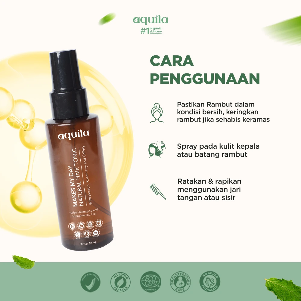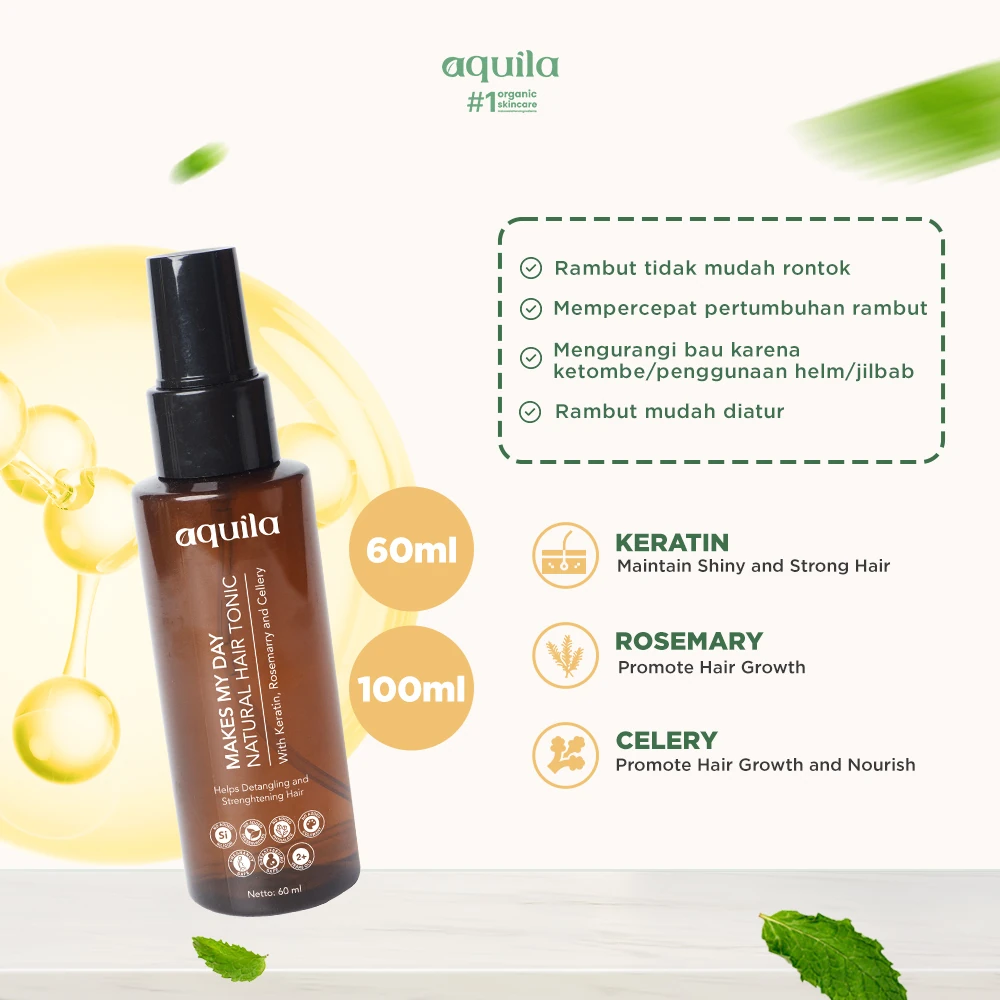 Hair Tonic yang efektif mengatasi rambut rontok dengan bahan alami dan organik, yaitu Keratin, Rosemarry, dan Celery yang membantu merawat pertumbuhan rambut, merawat kesehatan kulit kepala, memperkuat batang rambut, dan menutrisi sehingga tidak mudah rontok.