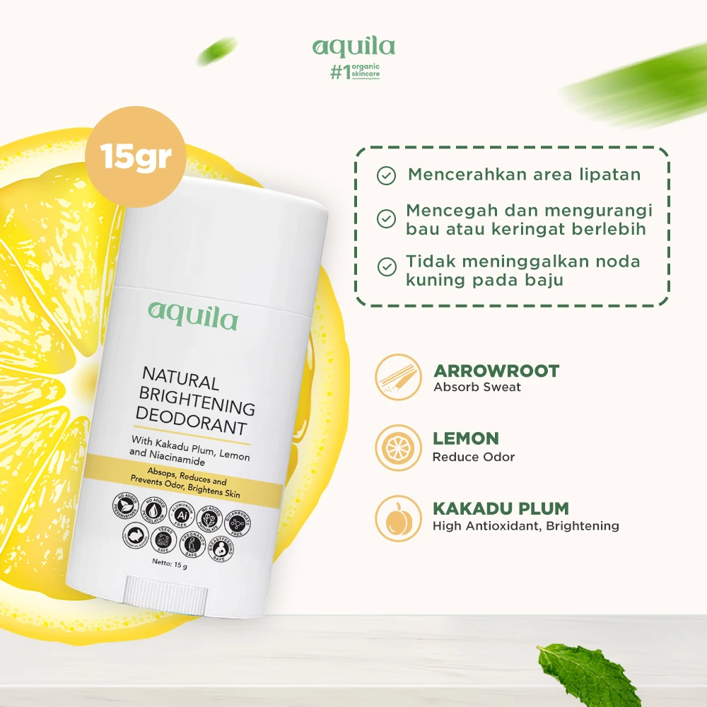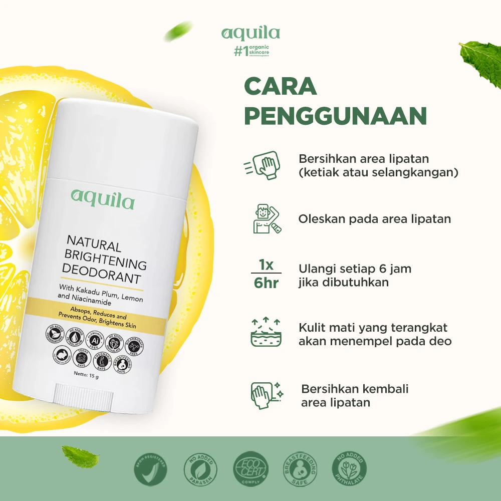Natural Brightening Deodorant dengan Kakadu Plum, Lemon, dan Arrowroot, deodorant alami dan organik yang mencegah bau badan dan mencerahkan kulit ketiak. Tanpa aluminium dan bahan kimia berbahaya, aman untuk semua usia, dan tidak meninggalkan noda kuning pada baju.