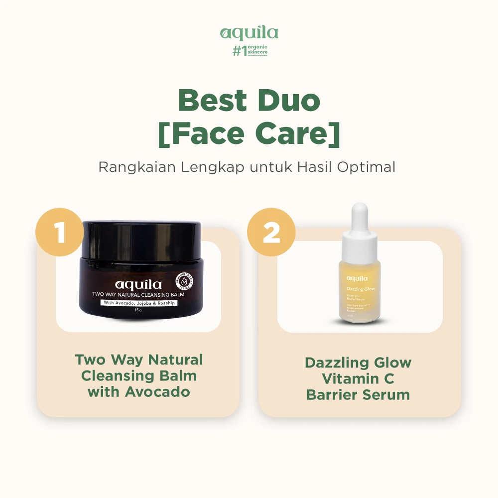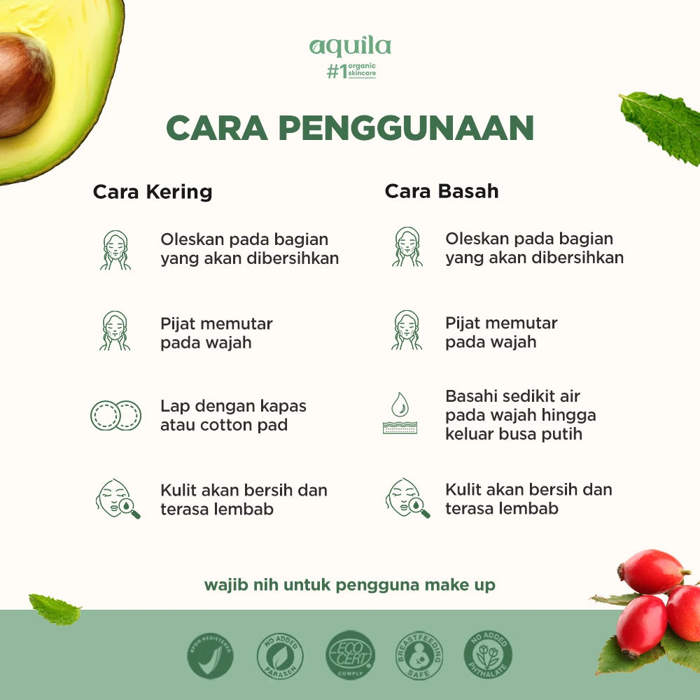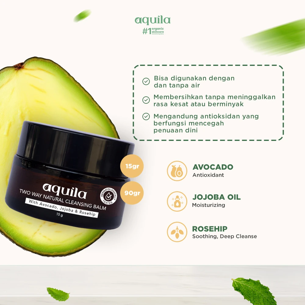 Aquila Herb Official Two Way Natural Cleansing Balm, pembersih wajah berbentuk balm yang efektif mengangkat kotoran dan makeup secara alami. Terbuat bahan alami dan organik yaitu avocado, jojoba, rosehip yang melembapkan, mencegah penuaan dini, dan membuat wajah tampak segar dan bersinar.