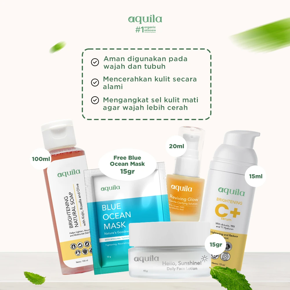 Berikan perawatan terbaik pada kulit wajah! Aquila Herb Glow Set berisi 5 produk yang diformulasikan dengan bahan-bahan natural dan organik sehingga aman untuk digunakan pada semua jenis kulit. Diformulasikan khusus untuk membantu memudarkan flek hitam, meratakan warna kulit, dan memberikan kilau sehat alami.
